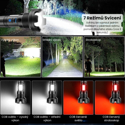 🔦 7 světelných režimů a nastavitelný paprsek