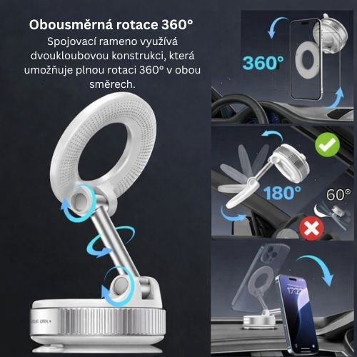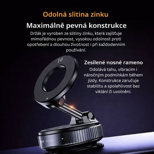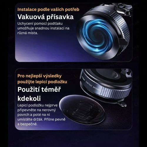 Zesílená mechanická přísavka funguje na principu podtlaku a zajišťuje okamžité přichycení bez použití nářadí či vrtání. Po upevnění na hladký povrch (čelní sklo, palubní deska, okno apod.) drží pevně na místě bez sklouzávání nebo odlepování.