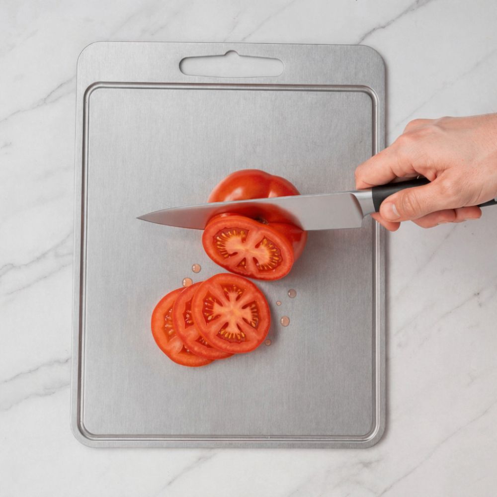 Kuchyňské nože mají obvykle tvrdost 55–60 HRC, zatímco krájecí prkénko TitaniumChef™ má tvrdost přibližně 36–40 HRC.