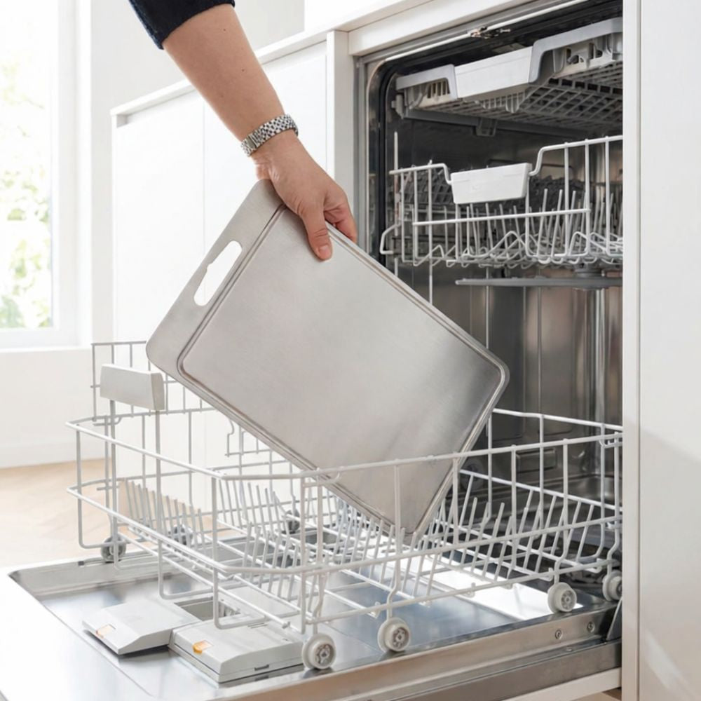 Titan je plně vhodný do myčky nádobí. Nerezaví, nemění barvu a není ovlivněn vysokými teplotami, solí ani silnými čisticími prostředky. Prkénko TitaniumChef™ můžete bez obav mýt v myčce, takže zůstává hygienické a vždy připravené k použití.